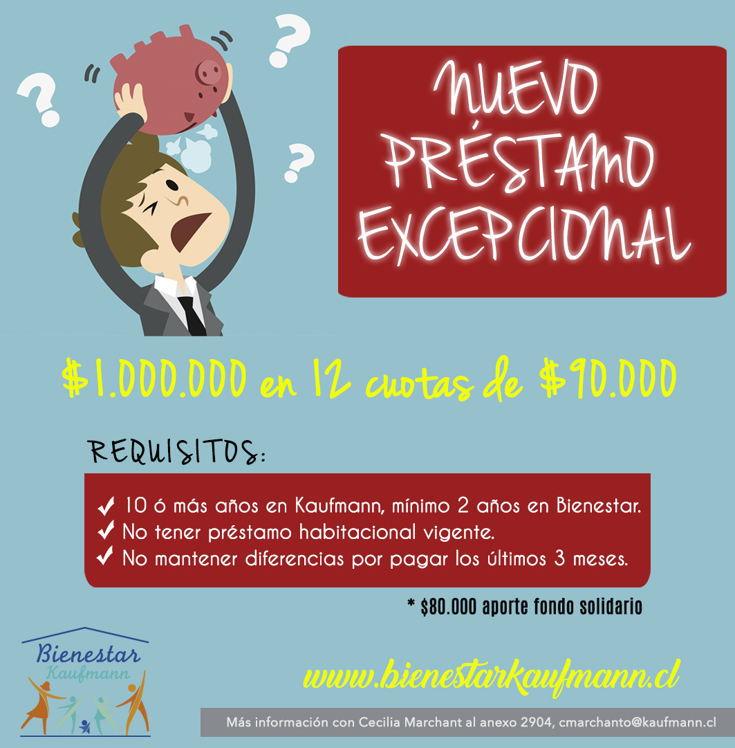Para solicitar envía un mail a Daniela Osses dosses@kaufmann.cl (antes de las 16 hrs.), este préstamo lo depositamos en tu cuenta bancaria el mismo día en que lo solicites.